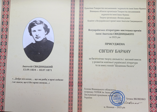 Євген Баран серед лавреатів всеукраїнської літературно-мистецької премії імені Анатолія Свидницького за багатолітню творчу діяльність і вагомий внесок у розвиток новітньої української літератури та за книгу поезій «Щоденник Пилата».