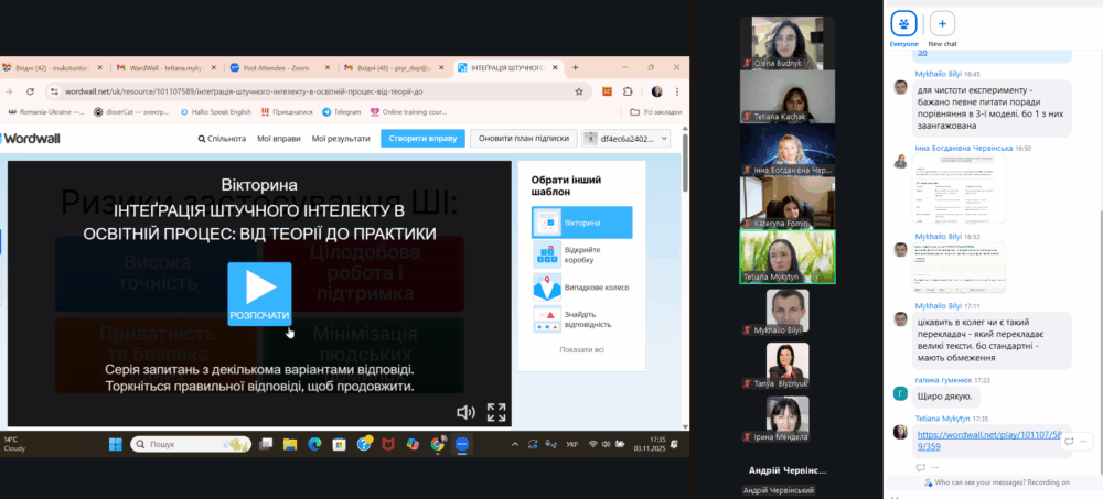 Завершено курси підвищення кваліфікації для науково-педагогічних працівників, які забезпечують навчання здобувачів освіти у закладах фахової передвищої та вищої освіти, на тему «Інтеґрація штучного інтелекту в освітній процес: від теорії до практики» у рамках реалізації «Положення про політику відповідального використання технологій штучного інтелекту» (Наказ в.о. ректора КНУВС від 15 вересня 2025 р. № 820), що проходили на базі Центру інноваційних освітніх технологій «PNU EcoSystem» у період з 27 жовтня по 03 листопада 2025 року. До курсів у дистанційному форматі було залучено 55 учасників, більшість з яких – викладачі Івано-Франківського національного медичного університету та Карпатського національного університету імені Василя Стефаника.